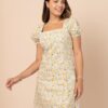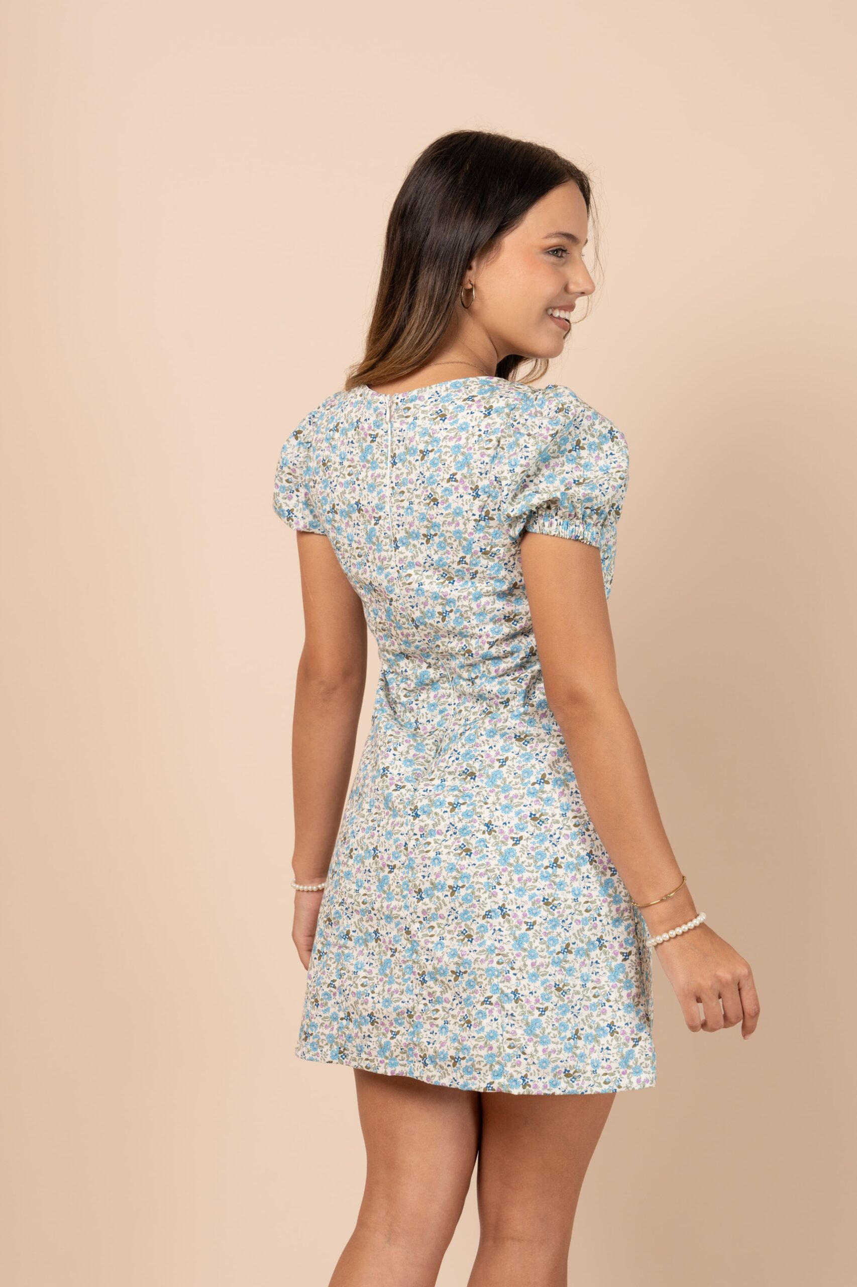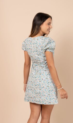 Confeccionado en Popelina de algodón estampada, lleva forro, pinzas adelante y atrás dándole ese corte de princesa para estilizar en la zona de la cintura, mangas abullonadas, escote recto.